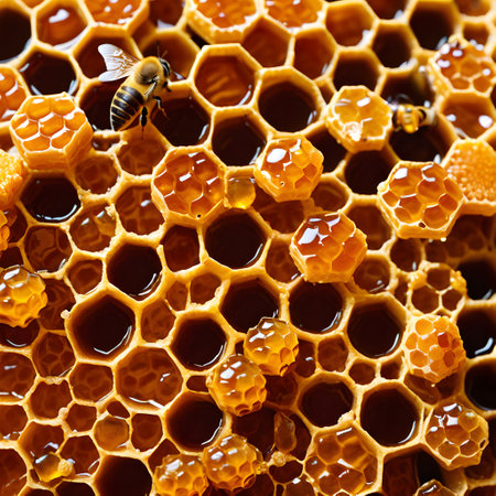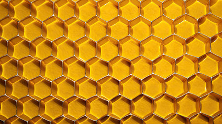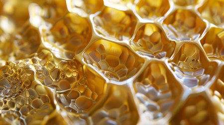 A creative digital illustration depicting Golden honey forming recursive honeycomb voids, intricate macro view, diffused overhead light, elegant commercial style. This AI-generated artwork features unique visual elements suitable for various commercial and editorial applications. AI-generated illustration.