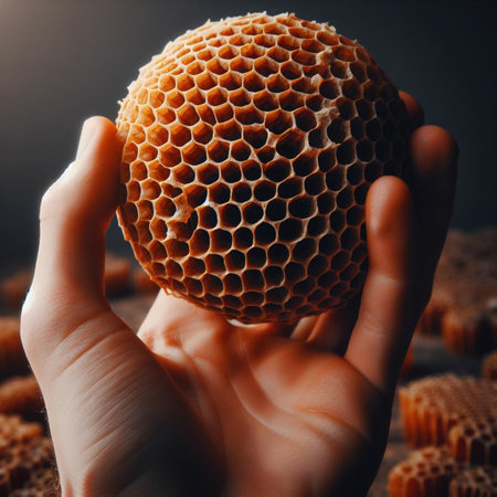 A dedicated beekeeper delicately holds a vibrant honeycomb, where shimmering honey glistens among the intricate hexagonal patterns, bringing the beauty of nature's work to life.