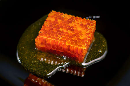 Amber sweet honey in a honeycomb on a black background