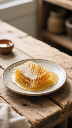 Cinematic, high-angle macro of raw honey perfectly filling the hexagonal cells of a natural, imperfe