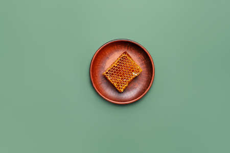 Plate with honey on color background