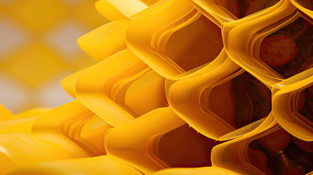 Digital image of close-up shot of the texture inside an empty honeycomb, showcasing its intricate patterns and rich colors. the background is a soft yellow to capture attention, creating a visually appealing composition that highlights the beauty within each cell. this detailed view emphasizes the