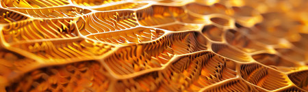 An intricate close-up of a honeycomb structure showcasing golden textures. The play of light and shadow enhances the geometric design, creating an organic yet abstract visual.