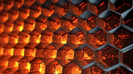 Abstract graphic hexagonal honeycomb dark orange yellow background with inner lit. Generative AI.