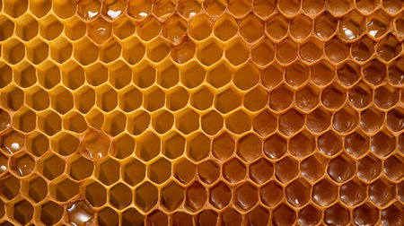 Exploring the intricate texture of honeycomb and golden honey in hexagonal formations