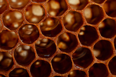 Honeycomb Texture Sweet nectar not yet extracted from the honeycomb. Background of honeycombs in dark golden hues. Macro shooting of honeycombs. Decorative background.