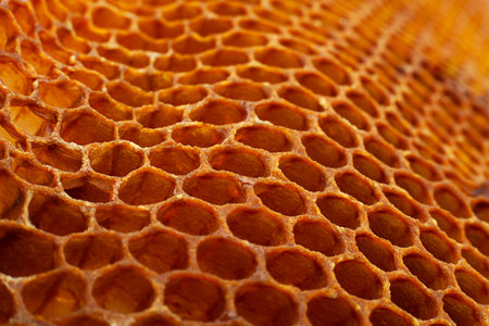 Detailed view of honeycomb structure, showcasing the hexagonal cells. Golden color and texture are prominent.