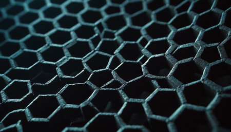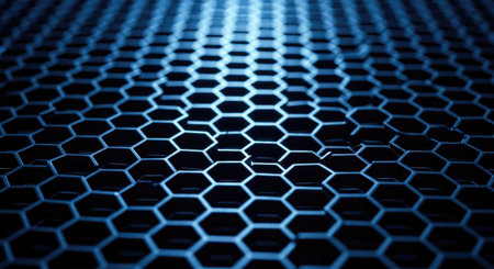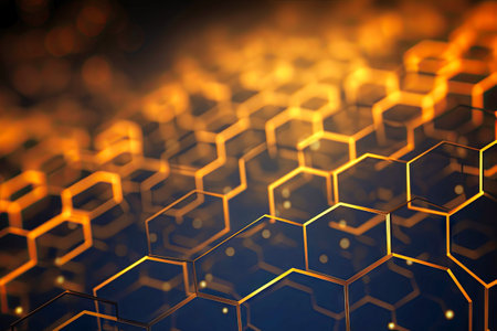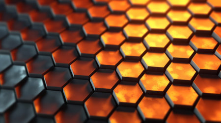 A modern digital concept of interlinked hexagons with glowing edges creates captivating visual effect. intricate design showcases blend of dark and luminous elements..
