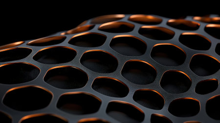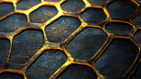 This image presents a close-up of a honeycomb-like pattern, featuring metallic gold and black elements. The intricate design suggests a geometric, abstract composition, possibly a detail from a larger structure or a decorative element. The image exhibits a high level of detail, with a shallow depth of field, suitable for various design applications.