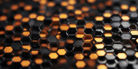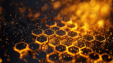 This image showcases a captivating pattern of hexagons, each emitting a warm golden glow. The hexagonal shapes are arranged in a repeating sequence, creating a mesmerizing visual effect. The central hexagon is the brightest, with surrounding hexagons gradually dimming, adding depth and dimension to the image.