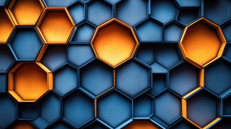 A modern, abstract background featuring a pattern of 3D hexagons in blue and orange. A blend of industrial and artistic design.