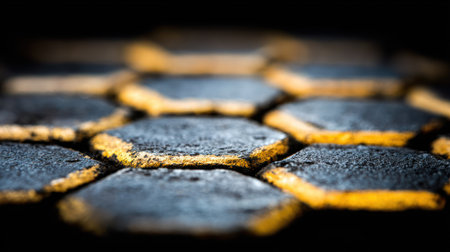 Extreme photograph featuring a close formation of hexagonal shapes. The centers of these shapes are dark gray or black and appear rough or gritty, while the edges defining each hexagon are illuminated with a contrasting bright yellow or gold color, creating a strong visual border against the dark background. The shallow depth of field keeps only a few central shapes in sharp focus.