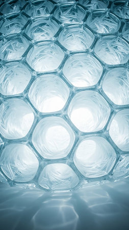 A close-up of a hexagonal network structure with glowing orange edges and blue-tinted glass-like cells.