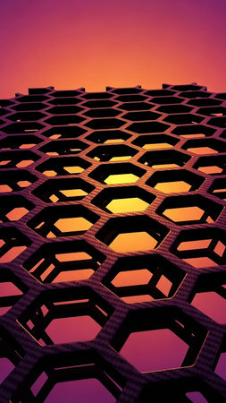 With showing dark hexagonal grid structure with vibrant orange and purple gradient sky background keywords: hexagon, grid, structure, pattern, geometric, dark,...
