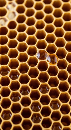 An intricate close-up of a honeycomb structure showcasing golden textures. The play of light and shadow enhances the geometric design, creating an organic yet abstract visual.