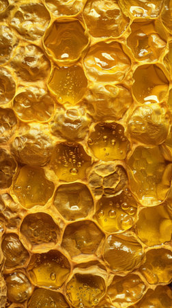 This close-up image captures the intricate patterns and textures of honeycomb filled with golden honey, highlighting the beauty of natural sweetness.