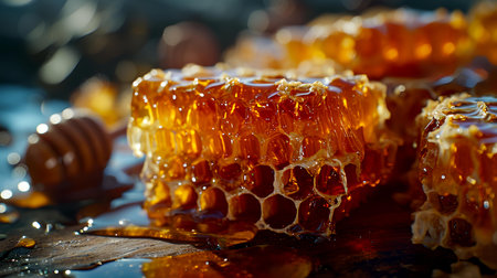Golden honeycomb pieces are displayed with glistening droplets surrounding them. Soft light enhances their rich texture and natural beauty, creating an inviting scene.