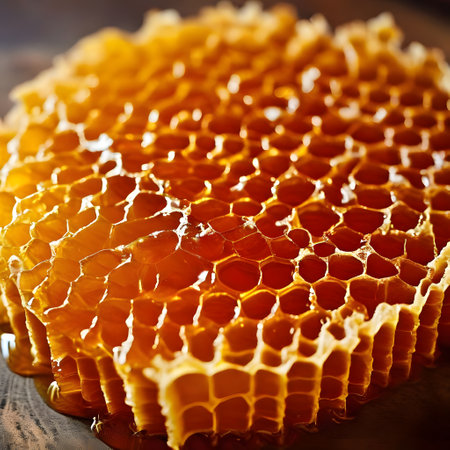 A stunning close-up shot of glistening honeycomb reflecting sunlight, sitting on rustic wood, perfect for food lovers and culinary art inspiration.