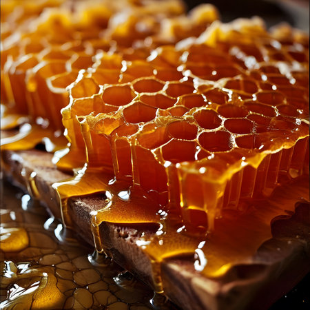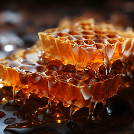 A stunning macro shot of honey oozing from a fresh honeycomb, with golden tones glowing against a dark background.