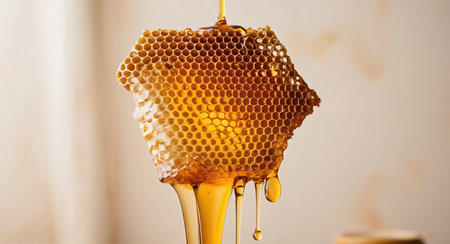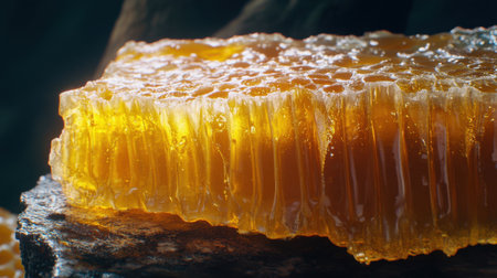 A mouthwatering detail shot of honey drizzling from a honeycomb, glowing beautifully against a dark background.