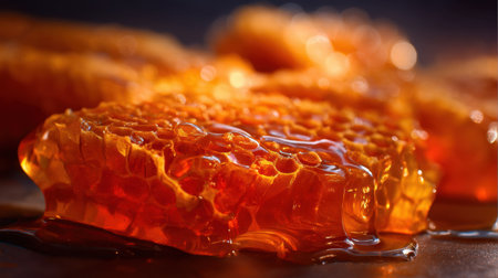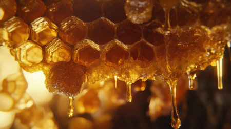 A luscious honeycomb dripping thick, amber honey, with warm lighting enhancing its organic beauty.