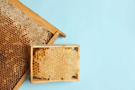 Honeycomb frames on light blue background, flat lay with space for text. Beekeeping