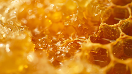 Close-up view of an enchanting honeycomb structure, showcasing golden hues and sparkling light highlights that evoke a sense of sweetness and nature.