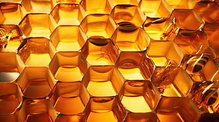 close-up of hexagonal honeycomb pattern with golden honey, created with generative ai