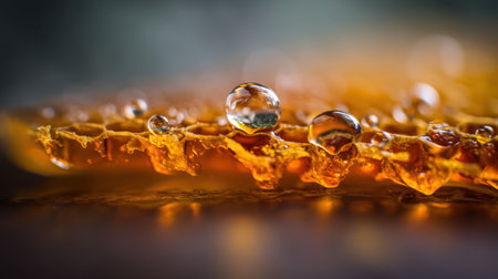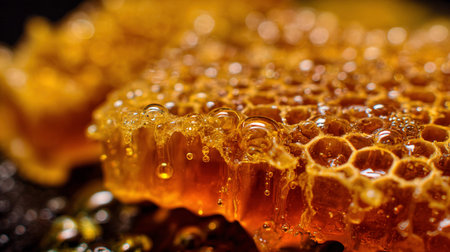 A stunning close-up view of a piece of honeycomb showcasing golden tones, glistening honey, and water droplets on a dark background.
