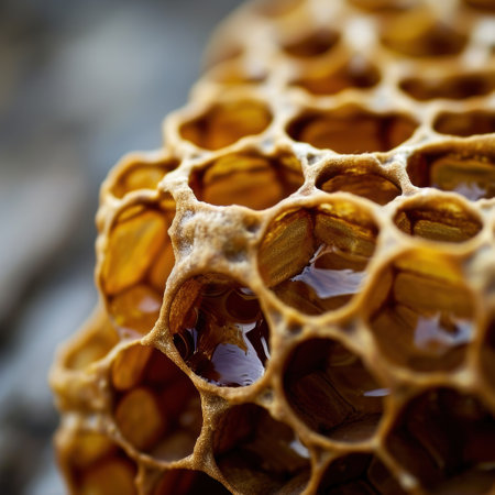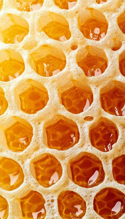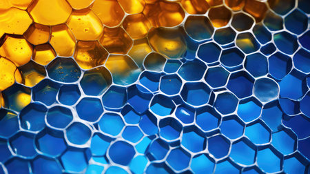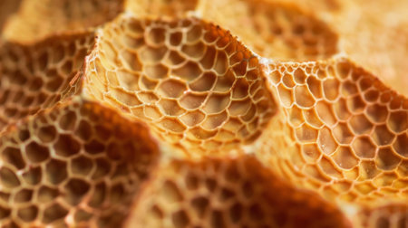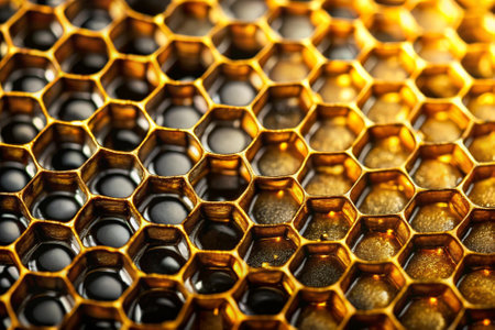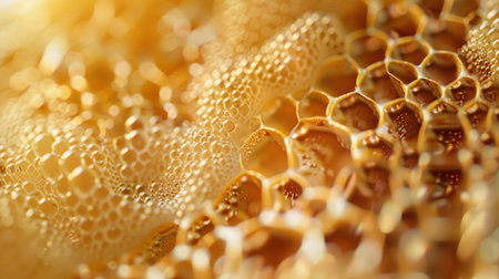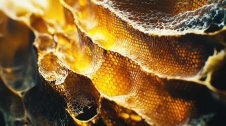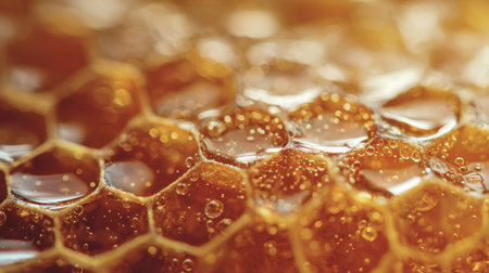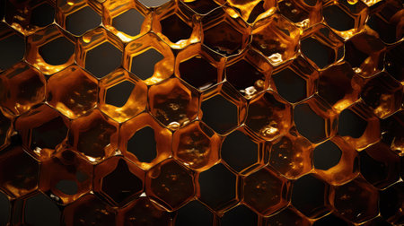 Exploring the intricate texture of honeycomb and golden honey in hexagonal formations
