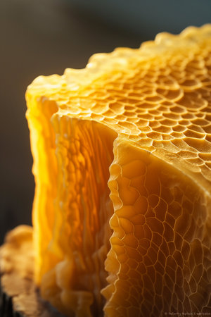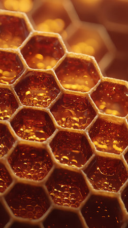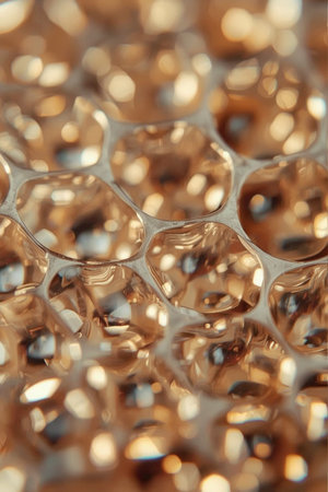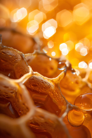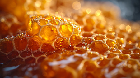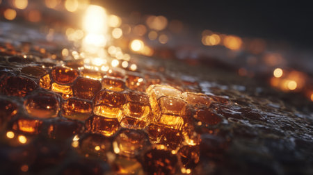 Close-up view of an enchanting honeycomb structure, showcasing golden hues and sparkling light highlights that evoke a sense of sweetness and nature.