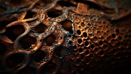 Honeycomb pattern in rusty metal, bee markings on hexagon shape generated by artificial intelligence