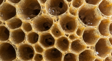 A magnified view of an organic cell structure. The intricate network creates numerous compartments filled with a golden substance, highlighting natures detailed designs and colors.