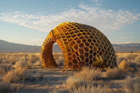 Honeycomb shaped structure is standing in a dry, desert landscape with mountains in the background