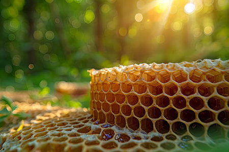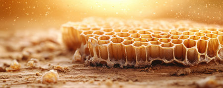 Close-up view of an enchanting honeycomb structure, showcasing golden hues and sparkling light highlights that evoke a sense of sweetness and nature.