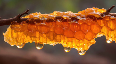 A close-up image of a vibrant honeycomb on a branch, glistening with fresh honey droplets. The rich golden color and texture showcase the beauty of nature's sweetness.