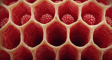This macro image reveals a series of interconnected red honeycomb cells, each containing a spiky spherical structure. The composition utilizes a close-up perspective, highlighting the detailed textures and rich color palette. This striking visual could be suitable for scientific publications or abstract design projects.