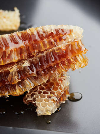 Close up view of the fresh honeycombs taken from a hexagonal honeycombs filled with golden honey.