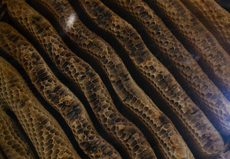 Honeycomb Texture Sweet nectar not yet extracted from the honeycomb. Background of honeycombs in dark golden hues. Macro shooting of honeycombs. Decorative background.
