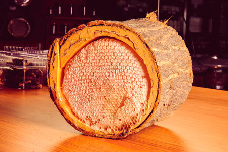 AI Generated. Natural Honeycomb Structure on Wooden Surface