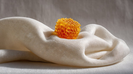 A beautiful honeycomb sits elegantly on soft beige fabric, highlighting its unique texture and vibrant color, perfect for culinary, natural, or artistic themes.