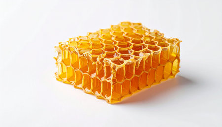 A perfect, golden block of fresh honeycomb rests on a clean white surface, showcasing its intricate hexagonal cells. This image captures the pure, raw sweetness of natures architecture, ideal for concepts of health, wellness, and organic products.