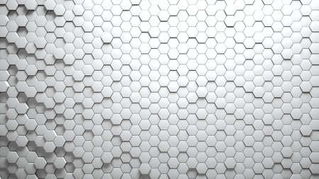 3D rendering of abstract hexagonal geometric white surfaces in virtual space. Randomly placed geometric shapes. Polyhedral wall of hexagons
