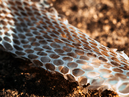 Bright macro photo of a discarded snake skin lying on the ground in sunset sunlight