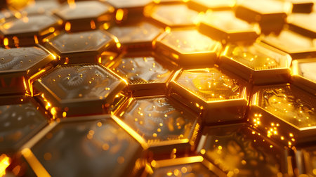 This image showcases a captivating pattern of hexagons, each emitting a warm golden glow. The hexagonal shapes are arranged in a repeating sequence, creating a mesmerizing visual effect. The central hexagon is the brightest, with surrounding hexagons gradually dimming, adding depth and dimension to the image.