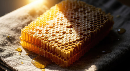 Glossy yellow golden honey comb sweet honeycomb drips flow during harvest background honeybee theme