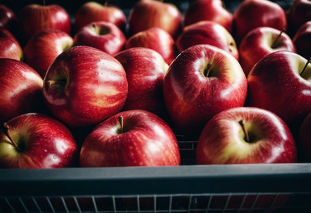 A colorful assortment of red apples is neatly arranged on a supermarket counter, inviting customers to explore and select fresh fruit. Generative AI.
