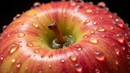 This close-up image captures a fresh red apple adorned with glistening water droplets, highlighting its vibrant color and natural texture, perfect for food-related content.
