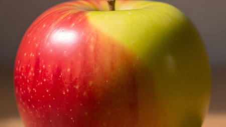 A macro close-up captures the smooth, transitioning skin of an apple, blending vibrant red and green hues. The detailed texture and soft lighting highlight the freshness and natural beauty of the fruit.