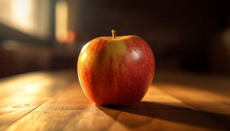 Lustrous red apple resting on a natural wooden table surface